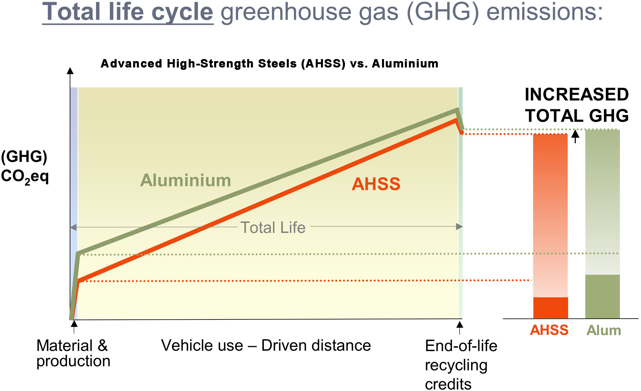 - Net result of all of this from a life cycle perspective is that aluminium cars, even though they might be slightly lighter, often result in higher life cycle emissions. Or, at best, they show only a minor advantage compared to Advanced High-Strength Steel cars over the total vehicle life cycle in terms of emissions savings (see example below).