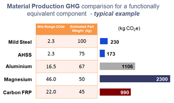 Even though less material is used to make the same component, alternatives to steel produce 7 to 20 times more manufacturing emissions. These high manufacturing emissions are difficult to offset in use phase fuel savings in the vehicle lifetime.