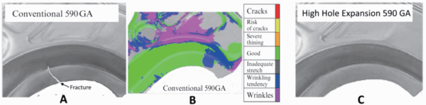 B-Pillar Upper stamped from 590 GA (a conventional galvannealed steel with 590 MPa minimum tensile strength, shown in A) and HHE 590 GA (a steel with 590 MPa minimum tensile strength engineered for high hole expansion, shown in C). The simulation of the conventional 590 GA does not indicate forming issues, as shown in image B.